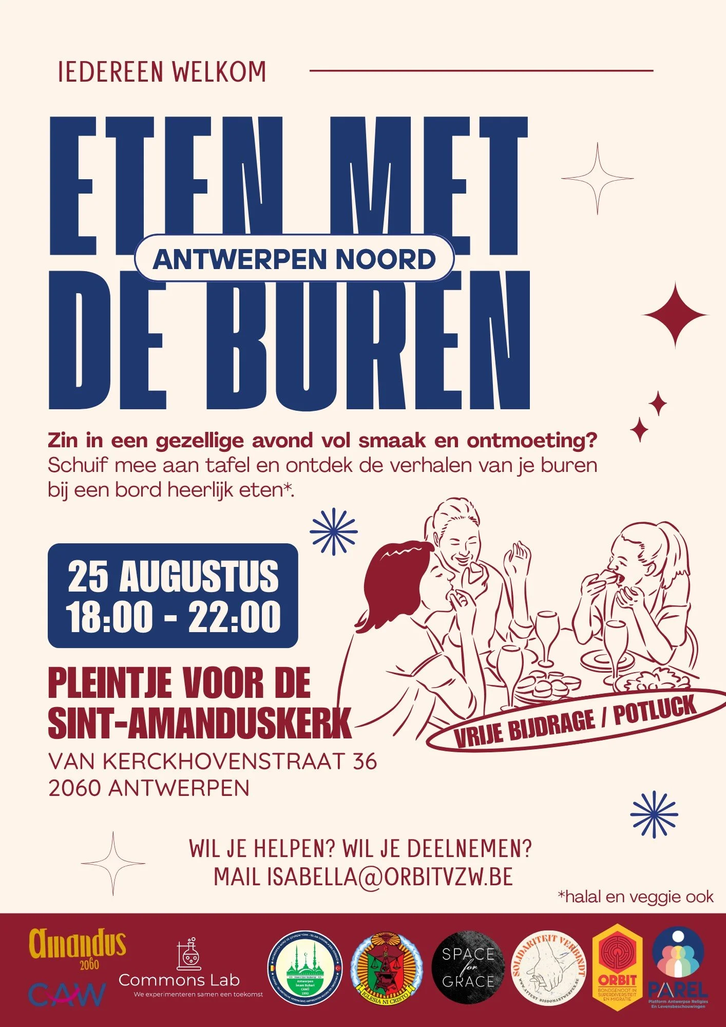 Met dit event willen we leden van verschillende gemeenschappen en buurtbewoners samen brengen om elkaar te leren kennen en in dialoog te gaan tijdens een gezamenlijke maaltijd. Ben je niet van de Amandusbuurt of Antwerpen Noord? Mag je alsnog aansluiten - iedereen is welkom!